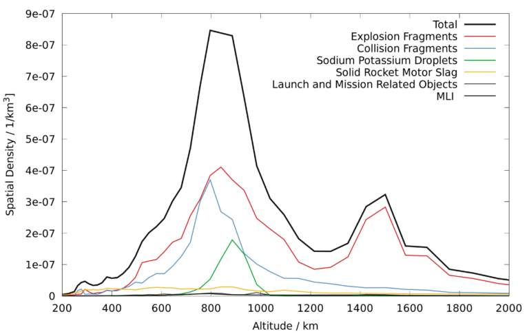 Space is crowded. As of date, more than 300,000 objects larger than 1 cm are in orbit around Earth1. The origins of these objects are many fold: Most large objects are satellites(active and used ones), rocket upper stages, and mission related objects such as adapter rings etc. Although they by far include most of the mass, their total count is comparably low: About 4500 satellites are in orbit (less than 2000 of them still active), ca. 2000 are upper stages. Greatest contribution in terms of number of objects are fragments, created during explosions and collisions. Most notable events from the latter kind are a Chinese anti-satellite test from 20072 and the collision between the active Iridium 33 and the old Cosmos 2251 satellites3. These three major contributors are accompanied by several other sources, such as sodium potassium droplets, released from nuclear reactors used on satellites between 1980 and 1988 and wastes created using solid rocket motors in rocket stages and satellites. This distribution of objects from these different sources along their orbital altitude is shown in Figure 1. Looking at this figure, it becomes apparent that, naturally, altitudes which are of most interest for satellite operators are also those that are populated the most.